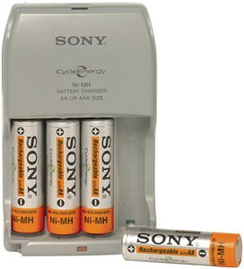Sony's Cycle Energy High Power Charger and rechargeable batteries are ideal for high capacity, high drain devices and can charge up to 4 AA/AAA Cycle Energy Batteries. It includes 4 AA 2,500 mAh Cycle Energy High Power rechargeable Nickel-Metal Hydride (NiMH) batteries that are economical, environmentally friendly, and can be charged 300x. They will last 5x longer than alkaline batteries. Sony’s Cycle Energy Power Charger has an automatic safety charge cut off function that monitors voltage and temperature, has a safety timer, and detects alkaline battery.